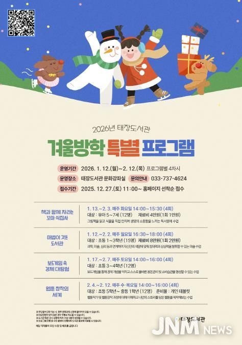 제이앤엠뉴스 | 원주시 태장도서관은 겨울방학을 맞아 1월 12일부터 2월 12일까지 겨울방학 특별 프로그램을 운영한다.