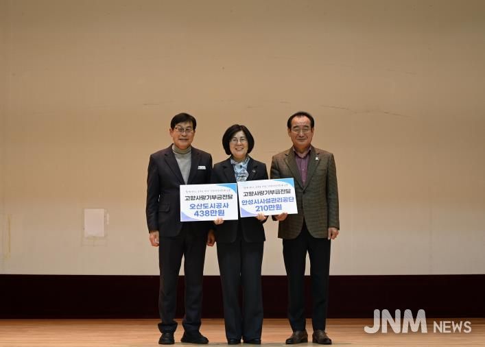 제이앤엠뉴스 | 안성시시설관리공단은 안성시와 오산시의 상생협력과 지역경제 활성화를 목적으로 안성시설관리공단과 오산도시공사가 중점적으로 추진한'고향사랑기부제 상호기부 전달식'을 개최했다고 밝혔다.