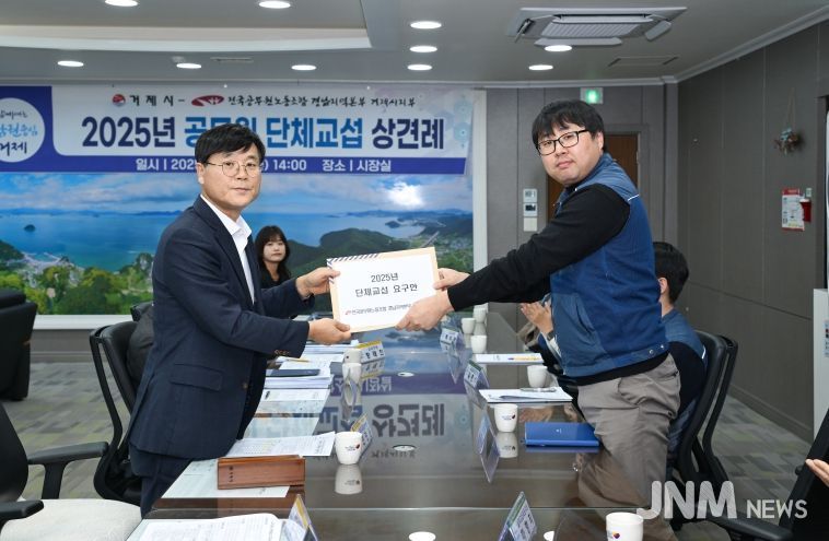 제이앤엠뉴스 | 거제시는 26일 시장실에서 전국공무원노동조합 경남지역본부 거제시지부(지부장 유해길)와 2025년 단체교섭을 위한 상견례를 가졌다고 밝혔다.