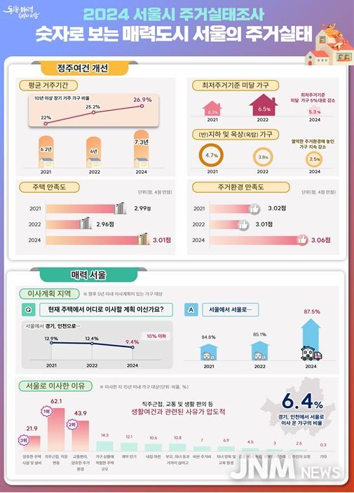 제이앤엠뉴스 | 최근 4년간 서울시민의 평균 거주기간이 6.2년에서 7.3년으로 늘어나 주거 안정성이 높아진 것으로 나타났다. 주택 만족도(3.01점)와 주거환경 만족도(3.06점)도 4점만점 기준 모두 상승해, 서울의 전반적인 정주여건이 개선되고 있는 것으로 분석됐다.