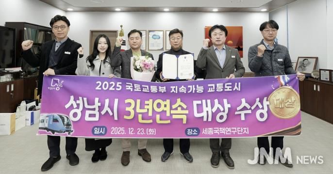 제이앤엠뉴스 | 성남시가 국토교통부 주관 ‘2025 지속가능 교통도시 평가’에서 대상을 수상하며 3년 연속 최고 평가를 받았다. 2023년과 2024년에 이어 올해까지 연속 수상을 이어가며, 친환경 교통 정책과 대중교통 중심 도시 전략의 성과를 다시 한번 입증했다.