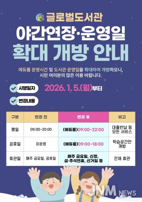 제이앤엠뉴스 | 의왕시 글로벌도서관(보식골로 30-10)이 시민들의 학습 편의 증진과 도서관 이용 활성화를 위해 2026년 1월 5일부터 도서관 이용 시간 야간 연장 및 공휴일 확대 운영을 실시한다.