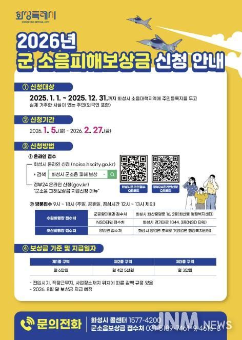 제이앤엠뉴스 | 화성특례시는 다음 달 5일부터 2월 27일까지 2026년 군 소음피해보상금 지급 신청을 받는다고 29일 밝혔다.
