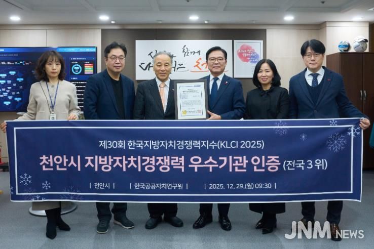 제이앤엠뉴스 | 천안시는 올해 한국지방자치경쟁력지수(KLCI) 조사에서 2년 연속 3위를 차지하며 (사)한국공공자치연구원으로부터 인증서를 받았다고 29일 밝혔다.