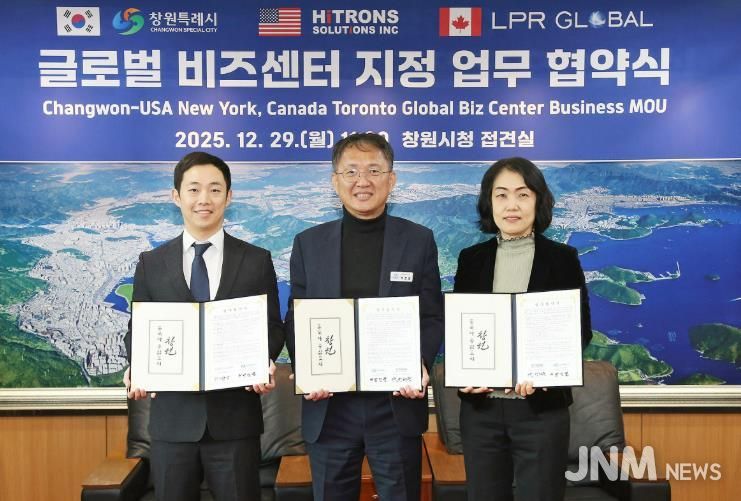 제이앤엠뉴스 | 창원특례시는 29일 시청 접견실에서 미국 뉴욕의 HITRONS SOLUTIONS(하이트론스 솔루션)와 캐나다 토론토의 LPR GLOBAL(엘피알 글로벌)을 ‘창원시 글로벌 비즈센터’로 지정하는 업무협약(MOU)을 체결했다고 밝혔다.