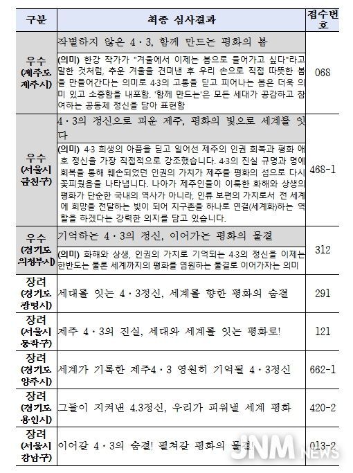 공모를 통해 선정된 우수작은 ‘작별하지 않은 4·3, 함께 만드는 평화의 봄’, ‘4·3의 정신으로 피운 제주, 평화의 빛으로 세계를 잇다’, ‘기억하는 4·3의 정신, 이어가는 평화의 물결’ 등 3편이다.