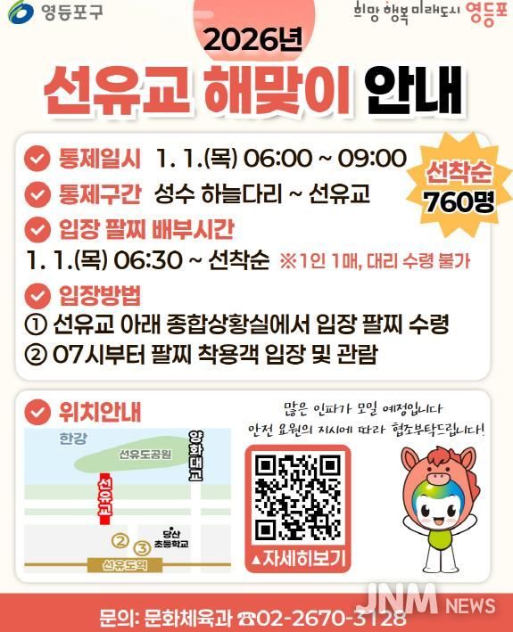 제이앤엠뉴스 | 영등포구가 2026년 1월 1일 새해를 맞아 해맞이 명소인 선유교를 찾는 시민들의 안전한 관람을 위해 현장 입장 인원을 선착순 760명으로 제한하는 등 사고 예방을 위한 인파 관리 대책을 마련했다고 밝혔다.