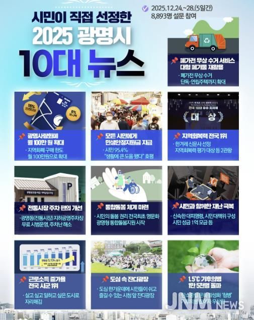 제이앤엠뉴스 | #광명시민이 직접 뽑은 2025년 10대 뉴스의 한 줄 평은 ‘위기 속에서도 흔들리지 않는 지속가능한 광명’이다. 고물가와 경기 둔화, 기후위기와 안전 불안이 이어진 한 해 속에서 광명시는 단기 성과보다 도시가 오래 버틸 수 있는 힘을 키우는 데 시정의 중심을 뒀다. 민생경제 대응부터 탄소중립, 돌봄·안전·공동체를 아우르는 구조적 변화까지 이어진 시정의 방향은 시민이 선정한 10대 뉴스에 고스란히 담겼다. 이는 2025년 광명시가 무엇에 집중했고, 어떤 기반을 다져왔는지를 분명히 보여준다.
