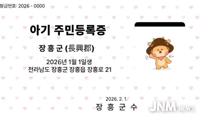 제이앤엠뉴스 | 장흥군이 내년 1월부터 ‘아기 주민등록증’ 무료 발급 서비스를 시행한다고 30일 밝혔다.