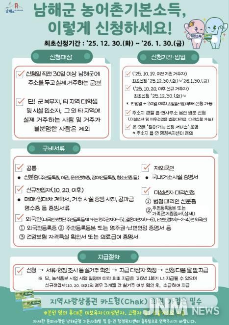 제이앤엠뉴스 | 남해군은 ‘농어촌 기본소득 시범사업’ 신청 접수를 오는 12월 30일부터 2026년 1월 30일까지 실시한다고 밝혔다.
