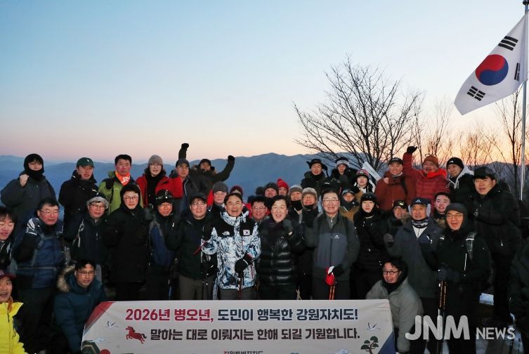 제이앤엠뉴스 | 김진태 강원특별자치도지사는 2026년 1월 1일 새해 첫 일정으로 도청 실국장 및 직원 30여 명과 함께 금병산에서 해맞이 산행을 진행했다.