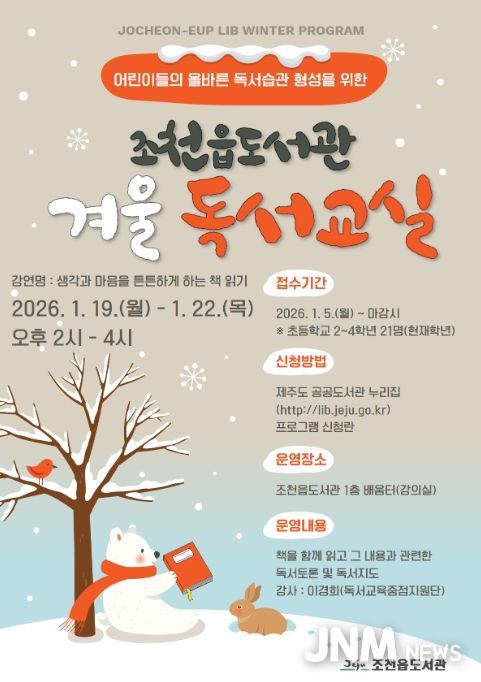 제이앤엠뉴스 | 제주시 조천읍도서관은 초등학교 2~4학년을 대상으로 하는 ‘겨울 독서교실’ 참여자를 5일부터 선착순 모집한다.