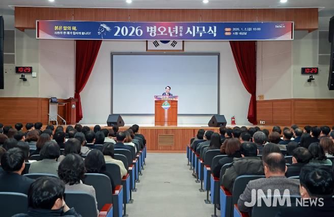 제이앤엠뉴스 | 사천시는 2일 오전 10시 시청 대강당에서 박동식 사천시장을 비롯해 김제홍 부시장, 국·소장 및 전 직원이 참석한 가운데 2026년 병오년 시무식을 개최했다.