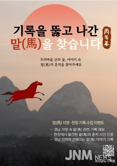 제이앤엠뉴스 | 경상남도기록원은 2026년 붉은 말(馬)의 해를 맞아 도민이 일상 속에서 발견한 말(馬) 관련 지명과 지역의 흔적, 개인의 기억을 기록으로 남기는 도민 참여형 기록 이벤트'기록을 뚫고 나간 말을 찾습니다'를 추진한다고 밝혔다.