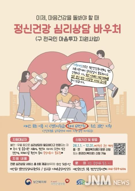 제이앤엠뉴스 | 예산군보건소 정신건강복지센터는 우울·불안 등 정서적 어려움을 겪는 군민의 마음건강 돌봄과 정신질환 조기 발견, 자살 예방을 위해 ‘정신건강 심리상담 바우처사업’을 추진하고 있다.