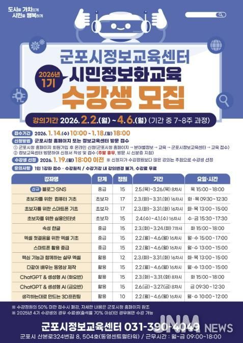 제이앤엠뉴스 | 군포시는 시민들의 정보화 시대에 대한 적응 능력 향상 및 정보 소외 계층의 디지털 격차 해소를 위해 운영되는 ‘2026년 1기 시민정보화교육’의 수강생을 오는 1월 14일부터 1월 18일까지 모집한다고 밝혔다.