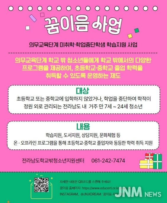 제이앤엠뉴스 | (재)전라남도청소년미래재단 학교밖청소년지원센터(센터장 이윤조)는 2025년 한 해 동안 도내 학교 밖 청소년을 대상으로 ‘의무교육단계 미취학·학업중단학생 학습지원 사업(꿈이음)’을 운영하며, 학습 공백 해소와 배움의 기회 회복을 위한 다양한 지원을 추진했다.