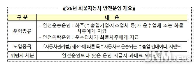 제이앤엠뉴스 | 국토교통부는 ’26년에 적용되는 화물자동차 안전운임을 1월 중에 확정하여 고시할 예정이라고 밝혔다.