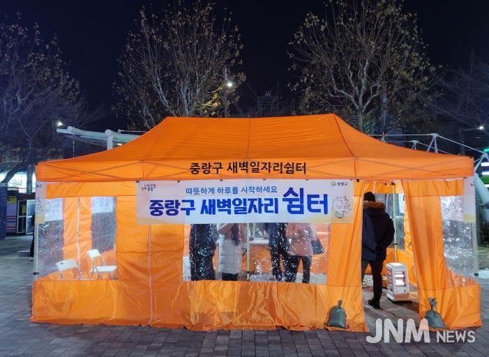 제이앤엠뉴스 | 중랑구는 겨울철 한파 속에서도 새벽 시간대 야외에서 구직활동을 이어가는 건설 일용근로자들의 구직환경 개선을 위해 1월 8일부터 3월 13일까지 면목역 광장에서 ‘새벽일자리 쉼터’를 운영한다. ‘새벽일자리 쉼터’는 이른 새벽부터 면목역 광장에 모여 구직활동을 하는 건설 일용근로자들이 추위를 피해 대기할 수 있도록 조성된 임시 쉼터다. 구는 천막 형태의 공간을 마련해 근로자들이 보다 안전한 환경에서 일자리를 기다릴 수 있도록 했다.