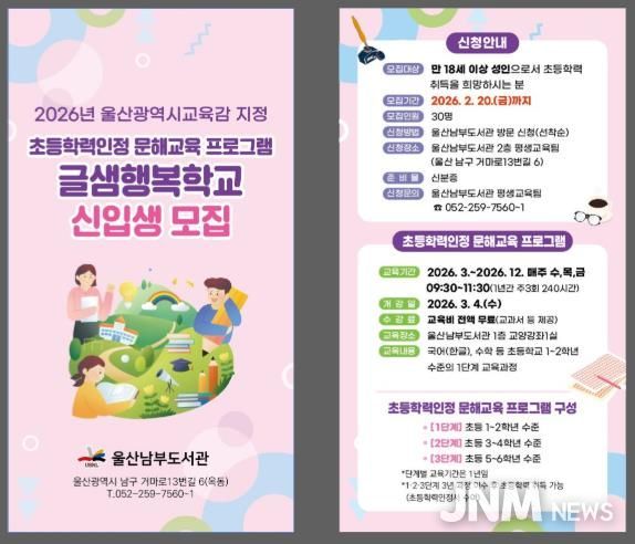 제이앤엠뉴스 | 울산남부도서관은 배움의 시기를 놓친 성인들에게 정규 학력 취득의 기회를 제공하는 문해교육 프로그램 ‘글샘행복학교’의 신입생을 모집한다.