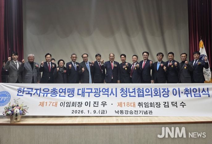 제이앤엠뉴스 | 한국자유총연맹 대구광역시지부(회장 전홍순)은 2026년 1월 9일 오후 2시, 대구광역시 남구 앞산공원 소재 낙동강승전기념관 대강당에서 한국자유총연맹 대구광역시지부 제17대·제18대 청년협의회장 이취임식을 성황리에 개최했다.