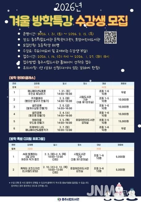 제이앤엠뉴스 | 충주시립도서관은 겨울방학을 맞아 관내 초등학생을 대상으로 겨울 방학특강 수강생을 모집한다고 13일 밝혔다.