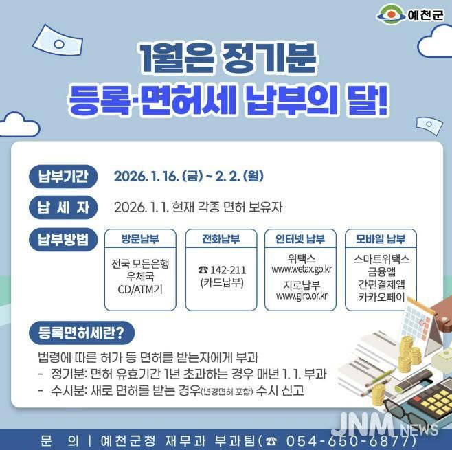 제이앤엠뉴스 | 예천군은 정기분 등록면허세 13,922건, 1억 9천8백만 원을 부과했다고 13일 밝혔다.