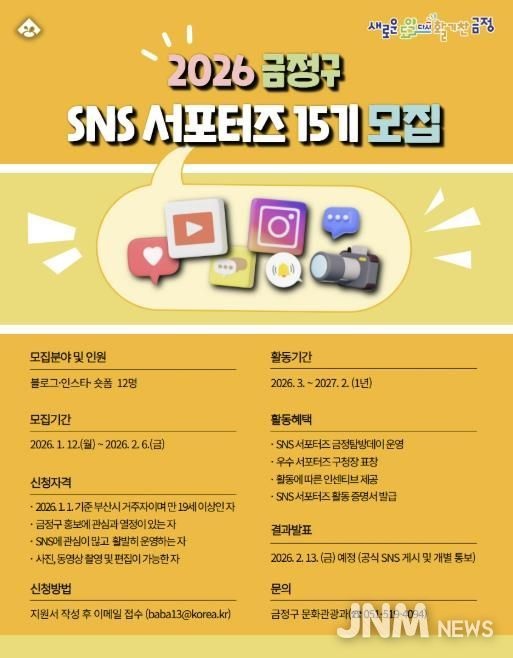 금정구는 오는 2월 6일까지 3개 분야(블로그, 인스타, 숏폼) SNS 서포터즈를 선발할 계획이라고 밝혔다.
