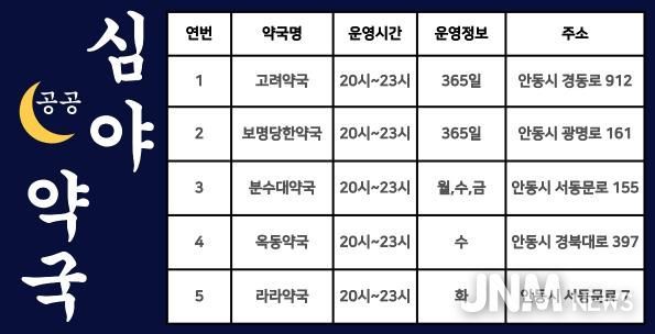제이앤엠뉴스 | 안동시는 시민의 의약품 접근성을 높이고 심야 시간대 의료 공백을 해소하기 위해 1월 1일부터 공공심야약국을 기존 2개소에서 5개소로 확대 지정해 운영 중이다.