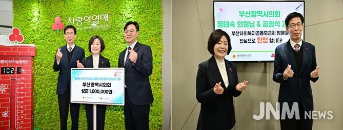 제이앤엠뉴스 | 부산광역시의회는 법제처가 주관하는‘우수 자치입법 활동 지방정부 평가’에서 광역 부문 우수 기관으로 선정되어 받은 포상금 100만 원 전액을 13일 오전 부산사회복지공동모금회에 기부하고 ‘희망 2026 나눔캠페인’에 동참했다.