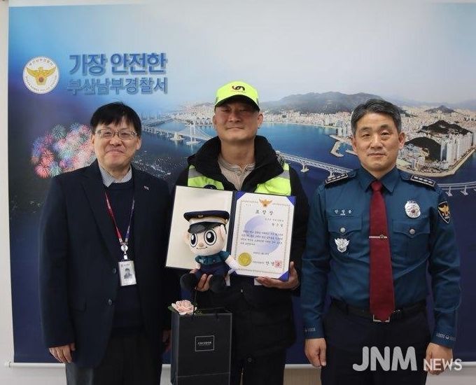 제이앤엠뉴스 | 부산 남구는 소속 환경관리원이 현금이 든 가방을 습득한 뒤 즉시 경찰에 신고해 분실자에게 무사히 돌려준 공로로, 지난 1월 13일 부산남부경찰서로부터 감사장을 수여받았다고 밝혔다.