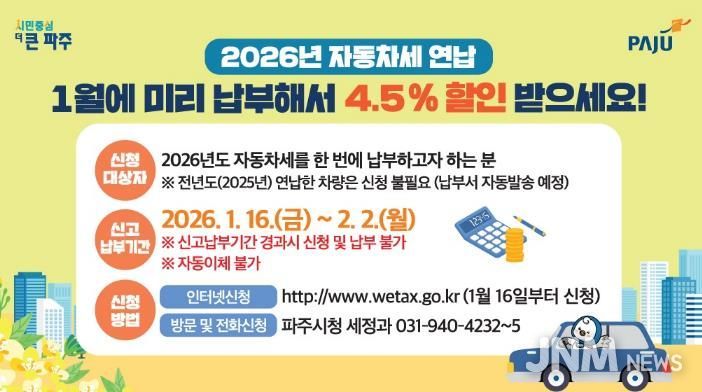 제이앤엠뉴스 | 파주시는 2026년도 자동차세를 1월에 한 번에 납부하는 경우 세액공제 혜택을 받을 수 있는 자동차세 연납 신청·납부를 2월 2일까지 접수한다고 밝혔다.