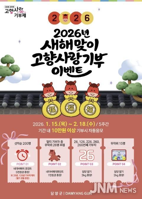 제이앤엠뉴스 | 담양군이 2026년 병오년(丙午年) ‘붉은 말의 해’를 맞아 1월 15일부터 2월 18일까지 5주간 고향사랑기부 이벤트를 실시한다.