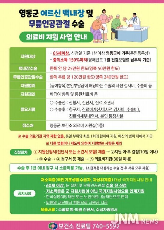 제이앤엠뉴스 | 충북 영동군은 경제적 부담으로 수술을 미루는 지역 어르신들의 치료 기회를 높이기 위해 2026년에도 ‘백내장 및 무릎인공관절 수술 의료비 지원사업’을 지속 추진한다.