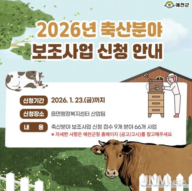 제이앤엠뉴스 | 예천군은 2026년도 축산 7개 분야 66여 개의 보조사업에 대해 23일까지 읍‧면 행정복지센터에서 신청을 받는다고 밝혔다.