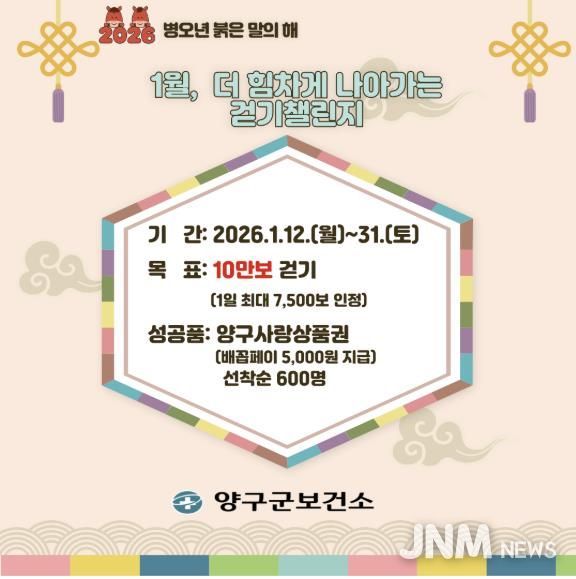 제이앤엠뉴스 | 양구군이 군민의 일상 속 신체활동 증진과 건강한 생활습관 형성을 위해 2026년 모바일 걷기 앱 ‘워크온(WalkOn)’을 활용한 걷기 챌린지를 연중 운영한다.