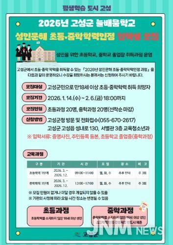 제이앤엠뉴스 | 고성군은 학력 취득을 희망하는 성인 학습자를 위한 학력인정 문해교육 프로그램인 ‘고성군 늘배움학교’의 2026학년도 입학생을 모집한다.