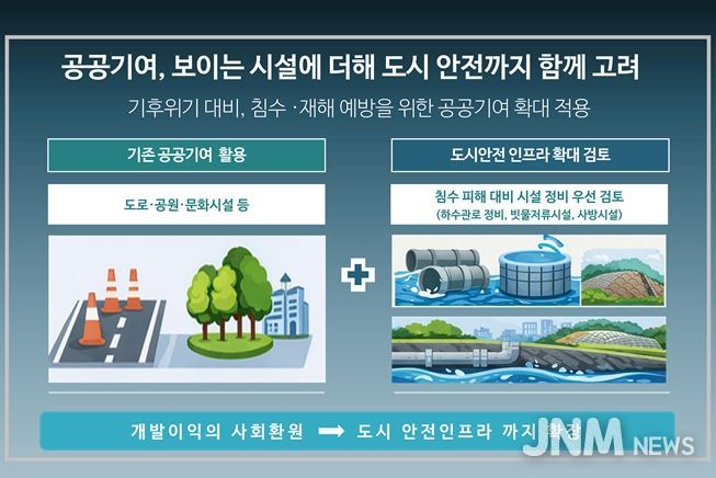 개발이익을 사회에 환원하는 ‘공공기여’ 제도를 통해 지금까지는 주로 도로·공원·문화시설 등 직접적인 공공 생활 인프라를 확충해 왔으나 시는 앞으로 활용 범위를 확대, 하수도 정비 등 안전 인프라에 우선 적용한다는 계획이다.
