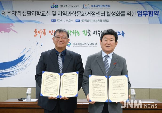 제이앤엠뉴스 | 제주특별자치도교육청은 14일 도교육청 상황실에서 (사)제주과학문화협회와 제주지역 과학문화 확산 및 미래 핵심역량 강화를 위한 업무협약을 체결했다.