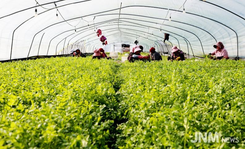 제이앤엠뉴스 | 경남 의령 자굴산(897m) 기슭 가례면 밭미나리 비닐하우스에서 14일 농민들이 겨울 추위를 뚫고 ‘자굴산 청정 밭미나리’ 수확에 한창이다.