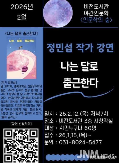 제이앤엠뉴스 | 평택시 비전도서관은 오는 2월 12일 저녁 7시 달 과학자 정민섭 작가를 초청하여 ‘나는 달로 출근한다’를 주제로 야간 인문학 강연을 진행한다.
