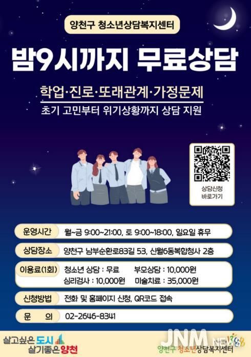 제이앤엠뉴스 | 양천구가 심리적·정서적 어려움을 겪고 있는 청소년의 건강한 성장을 돕기 위해 마음건강 지원 강화에 나섰다. 올해부터 청소년상담복지센터 개인상담 서비스를 전면 무료화하고, 평일 밤 9시까지 연장 운영에 돌입한다.