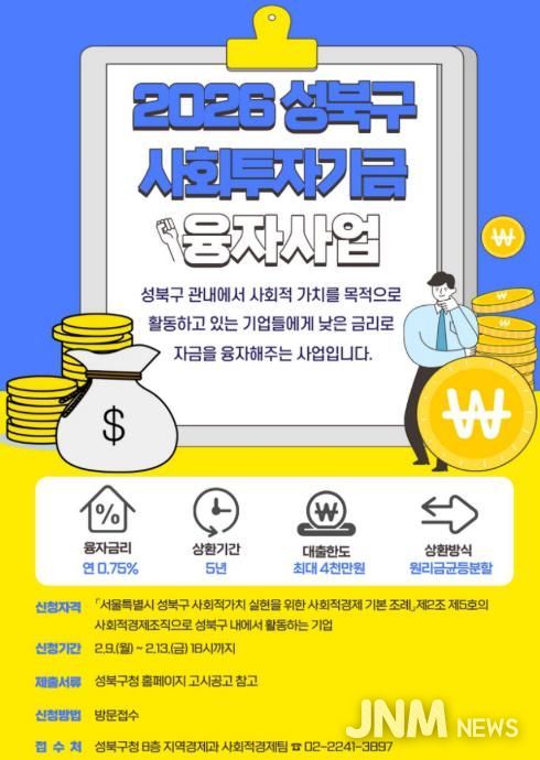 제이앤엠뉴스 | 서울 성북구가 ‘2026년 상반기 사회투자기금 융자 지원 사업’을 실시한다. 경제적 어려움을 겪는 관내 사회적경제 조직의 안정적인 운영을 돕기 위해서다.