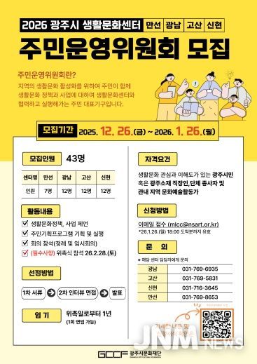 제이앤엠뉴스 | (재)광주시문화재단은 광주시 생활문화센터(만선·광남·고산·신현)에서 2026년에 활동할 주민운영위원회 위원을 통합 공개 모집한다고 밝혔다.