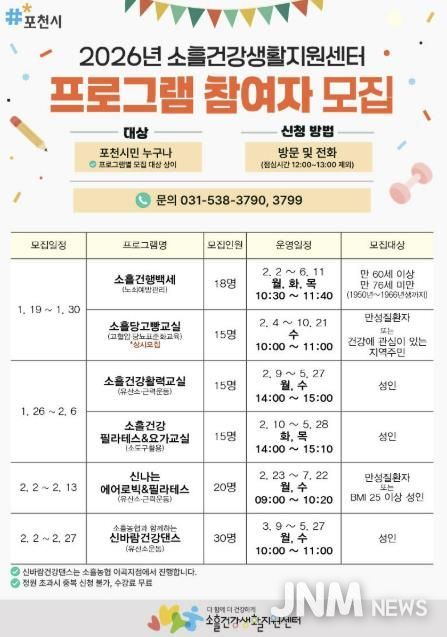 제이앤엠뉴스 | 포천시 소흘건강생활지원센터는 시민들의 건강 증진과 활기찬 일상 지원을 위해 오는 19일부터 ‘2026년 상반기 건강증진 프로그램’ 참여자를 모집한다.