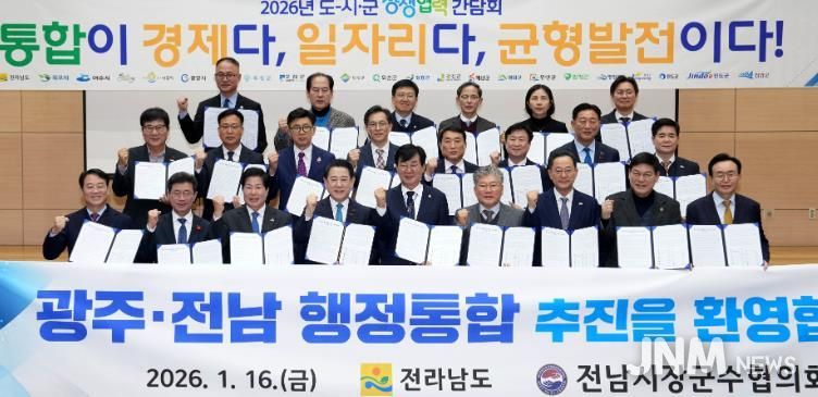 제이앤엠뉴스 | 전라남도는 16일 전남도청 왕인실에서 ‘2026년 도-시군 상생협력 간담회’를 열어 지역 대도약을 위한 광주·전남 행정통합 추진에 도와 22개 시군이 공동 보조를 맞추기로 했다.