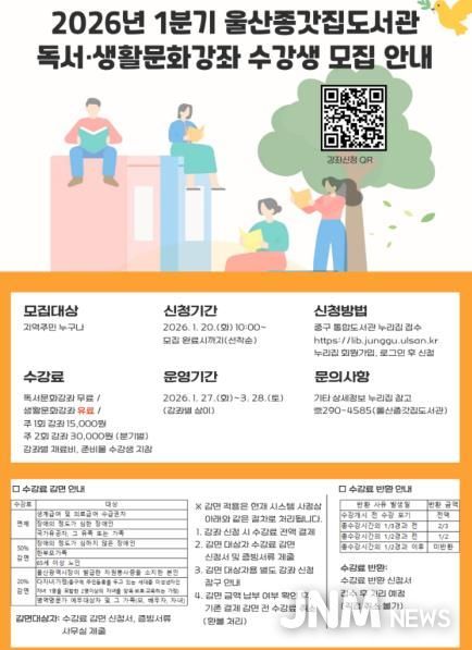 제이앤엠뉴스 | 울산 중구에서 운영하는 울산종갓집도서관이 2026년 1분기 독서·생활문화강좌 수강생을 모집한다