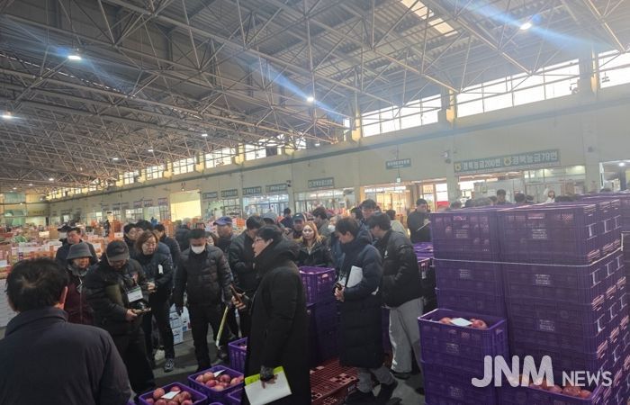 제이앤엠뉴스 | 포항시는 지난 16일 포항시 농산물 도매시장에서 사과 원물출하 첫 경매를 진행했다.