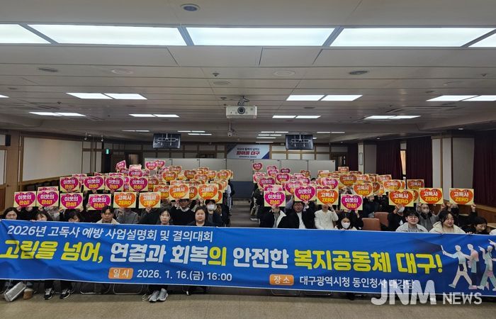 제이앤엠뉴스 | 대구광역시는 1월 16일, 시청 동인청사에서 9개 구·군 및 읍·면·동 고독사 예방사업 담당 공무원 160여 명이 참석한 가운데 ‘2026년 고독사 예방 사업설명회 및 결의대회’를 개최했다.
