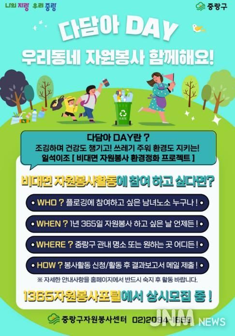 제이앤엠뉴스 | 중랑구 자원봉사센터가 환경 보호 실천을 돕기 위해 비대면 환경정화 자원봉사 프로그램 ‘다담아 DAY’를 연중 상시 운영한다.